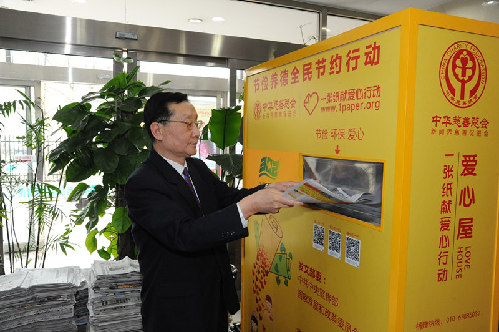 中华慈善总会会长李本公向“爱心屋”投递废旧报纸