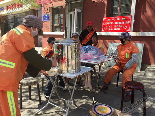“环卫工人是‘城市的美容师’,现在天气越来越热,他们每天在烈日下工作,很辛苦。我想为他们做点什么,想来想去,还是觉得摆个茶摊比较实际。这样,环卫工人们路过喝上一杯茶,歇一歇、解乏又解暑,多好!”杨克俊说,“环卫工们时间紧,用大碗喝茶,水盛得多也凉得快,喝着畅快!”于是杨克俊拿出1000元钱,购置了全新的保温桶、茶叶、碗、桌子、凳子。同时,他向工业路街道办事处吉安社区负责人说了自己的想法,得到办事处、社区领导的支持。经过一段时间的准备,杨克俊的爱心茶摊“亮相”建设东街,每天8时至18时,都会有路过的环卫工人去他的茶摊喝茶。(王晓娜、刘倩)