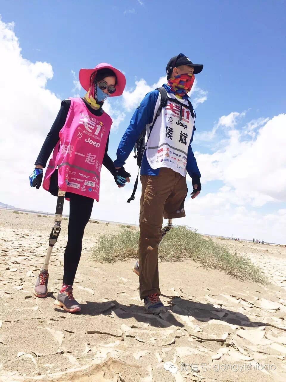 就在上一周,第十一届戈壁挑战赛如火如荼的开展了,残奥冠军侯斌和民族歌手尔码阿依一起手拉手走戈壁的故事,刷爆了朋友圈。5月22日,戈壁挑战赛开赛的第一天,一支特别的队伍在走戈壁。他们都是来自戈友公益基金会首次组建的无障碍跑团,10位身心障碍人士(包括侯斌和尔码阿依2位肢残人士,融爱融乐的5位自闭症,1位智力智障者以及2位视力障碍者),在20位公益大使和57位院校伴走志愿者的陪伴下,成功穿越了28.89KM的戈壁。