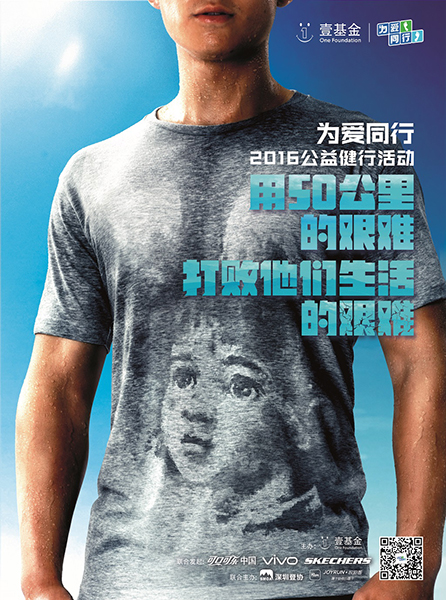 壹基金为爱同行是一个将深度体验和快乐参与相结合的户外公益徒步活动。参加者通过四人组队在一定时间内完成50公里山野徒步,在推广公益理念的同时为公益项目筹集善款,在行动中践行“尽我所能,人人公益”的理念。2016年活动主题为“用50公里的艰难打败他们生活的艰难”,将对困境儿童的关爱转换成参与者挑战50公里徒步的源动力,在他们与受助的困境儿童间建立更紧密的情感链接。改变的力量源于爱心的汇聚,截至发稿前,为爱同行深圳站累积23879捐款人次,筹集2085582.55元善款。