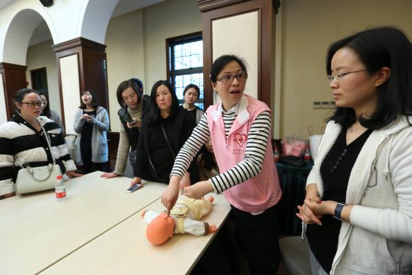 2016年3月27日,上海市儿童医院红十字南丁格尔志愿服务队举办儿童急救培训活动,志愿者现场向家长们传授心肺复苏及儿童急救技能。 视觉中国 图