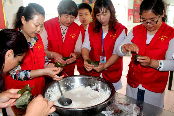 6月4日、5日上午,临沂青年志愿者协会、远通集团志愿者服务队、家和志愿者等志愿服务团队在端午节前夕,分别走进临沂市老年公寓、罗庄区老年公寓等地开展各种主题志愿服务活动。志愿者们买来了粽叶、糯米、大枣等食材,亲手为老年公寓的爷爷奶奶献上一顿爱心大餐。活动现场,志愿者们个个兴致高昂,包粽子技术不熟练的虚心向师傅学习,一次不成功又拆了重来,学习劲头十足。一张张绿色的粽叶在大家的手中瞬间变成了一个个有棱有角的爱心粽子。历时两个上午的时间,五大盆近500只粽子呈现大家眼前。志愿者煮好粽子后亲手送到老人手上。看着老年公寓的爷爷奶奶吃着甜甜的粽子,志愿者们感觉比自己吃了还香甜。同时,年轻的志愿者们还在活动间隙陪老人唠唠家常、读读报纸,志愿者赵磊还带来吉他为老人们表演节目,让老人们感受到了温暖和关爱。 (记者 庄成 通讯员 王金龙)