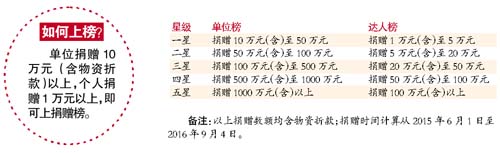据广州市慈善会负责人介绍,“2016广州慈善榜”由广州市文明办、广州市民政局指导,广州市公益慈善联合会、广州市慈善会主办,各区慈善会、各基金会等广州公益慈善组织联合发起,将于9月5日首个“中华慈善日”正式发布。榜单分为“广州慈善捐赠榜”和“广州慈善影响力榜”两大类,分别评选出一至五星“慈善单位”和“慈善达人”,以及最具影响力年度广州慈善企业、慈善人物、慈善组织、慈善项目各10个。
