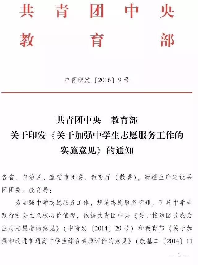2015年,教育部出台了《学生志愿服务管理暂行办法》,明确学校团组织、少先队组织负责学生志愿服务的具体组织、实施、考核评估等工作。此前,团中央出台了《关于推动团员成为注册志愿者的意见》、《中国注册志愿者管理办法》等,教育部出台了《关于加强和改进普通高中学生综合素质评价的意见》等。根据这些文件精神的要求,为加强中学生志愿服务工作,制定出台了本《意见》。
