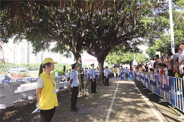 据介绍,现场指引组共计有100名志愿者,主要负责领导指引、观众指引等工作,协助公安维护现场秩序。在西枝江两岸设立志愿服务站帐篷,供志愿者休息和协调工作。竞赛裁判组共计有60名志愿者,负责协助现场裁判检录、计时、通知参赛队伍比赛道次以及竞赛标识、颁奖等工作,其中有4名女志愿者协助颁奖。“龙头点睛组负责在领导为龙舟点睛时,扶稳龙头不让它摇摆,12名懂水性的男志愿者需要着装整齐。”据介绍,共计有30名志愿者属于后勤保障组,主要为赛事提供搬运服务,为志愿者提供饮用水及送餐,给志愿者发放和收集志愿者服装等。