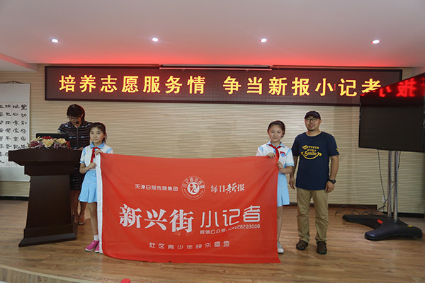 6月21日下午,在天津市和平区新兴街办事处,来自社区的志愿者、每日新报的记者和西康路小学的学生们齐聚一堂,庆祝新兴街“学生记者活动站”成立。