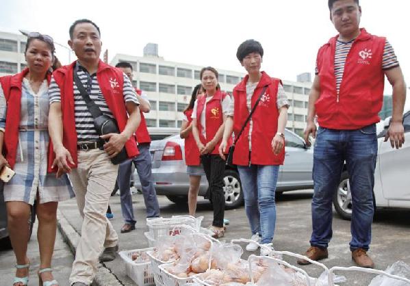 志愿者为安置点灾民送去鸡蛋等食物。(网友:群毅/摄)