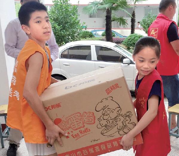 11岁小志愿者聂欣(右)和小伙伴一起帮忙搬食品(网友:洪仔/摄)
