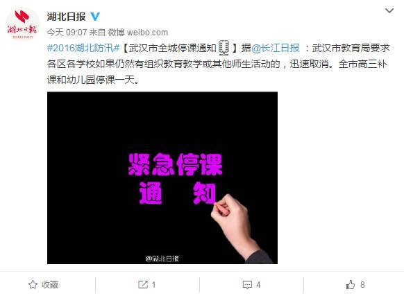 武汉市教育局要求各区各学校如果仍然有组织教育教学或其他师生活动的,迅速取消。全市高三补课和幼儿园停课一天。