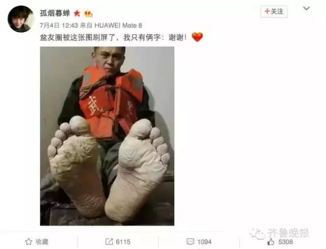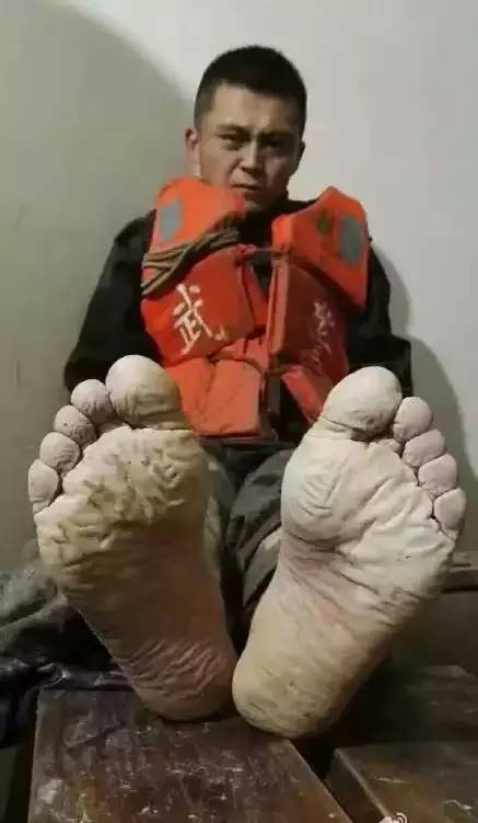 照片中的这名战士是武警安徽总队第一支队的战士焦磊。拍照的时刻是7月3日,焦磊在两条板凳上拼凑的“床”上小憩,此时,他的双脚已经在洪水里连续浸泡了19个小时,脱下鞋袜,双脚早已失去肉色,没有了知觉。