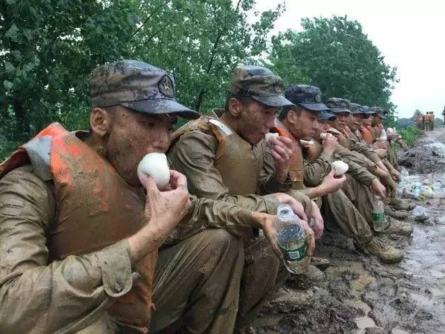 附近一位村民一直守在现场,看到官兵们迟迟不肯吃饭,就从镇上买来一大袋馒头和矿泉水,含着泪水硬劝官兵停下来吃口饭。为不辜负群众的好意,该连官兵短暂地停下手中工作,接过馒头和矿泉水,顾不上泥浆和雨水,直接啃了起来。