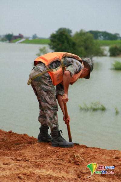 官兵们在加固大堤,防止渗水。中国青年网记者 周学磊 摄