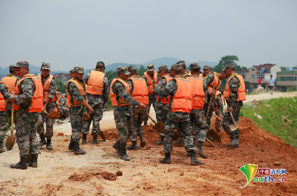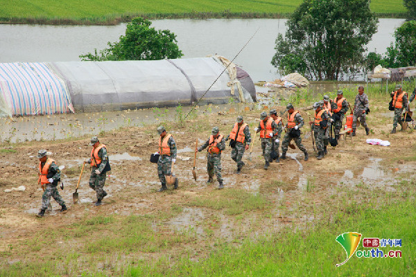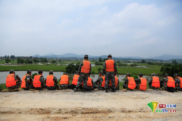 险情暂时解除,官兵们坐成一排,仍时刻守护在大堤上。中国青年网记者 周学磊 摄