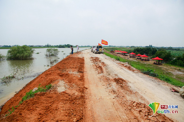 官兵们驻守在漳河平铺郑渡圩大堤。地面上的水是从漳河渗透过来,存在管涌风险。中国青年网记者 周学磊 摄