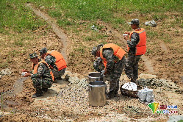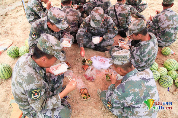 官兵们坐在地上吃午饭。中国青年网记者 周学磊 摄