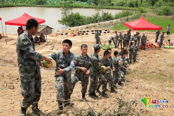轮休官兵在运送村民自发送来的西瓜。中国青年网记者 周学磊摄