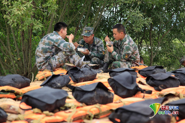 官兵们在吃村民送来的盒饭,配菜是鸡腿、排骨、海带和花菜。中国青年网记者 周学磊 摄