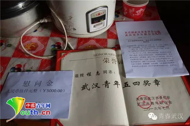 武汉团市委将荣誉证书送到程志父亲手中。 湖北团省委供图