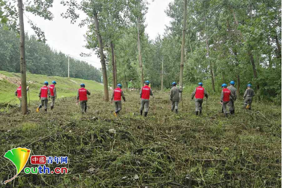 国网湖北省电力公司青年突击队队员在武金堤旁进行拉网式巡视。 中国青年网记者 李拓 摄