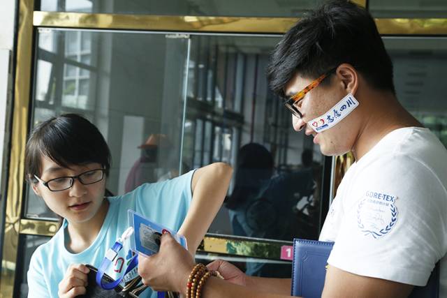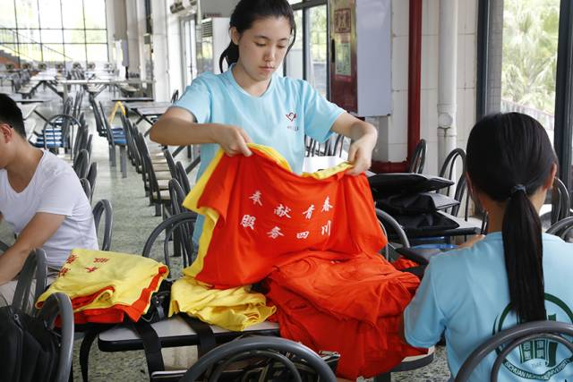 ▲认真整理物品的志愿者全程都没来得及抬眼,“奉献青春,服务四川”,T恤上的字太惹眼~