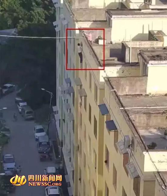 社区网格员马清平拿出家中的铁锤跑到6楼砸门,但因防盗门坚实,一时无法进入。这时,一名身穿白衣的年轻男子跑了过来,问正在砸门的马清平有没有绳子,马清平跑回家中找出麻绳,与白衣年轻男子一道冲上楼顶天台,系好麻绳,慢慢从窗户的侧边缓缓坠下。很快,白衣年轻男子靠近小女童悬挂的位置。悬空力量有限,他每挪动一步,街坊都深深吸一口气。