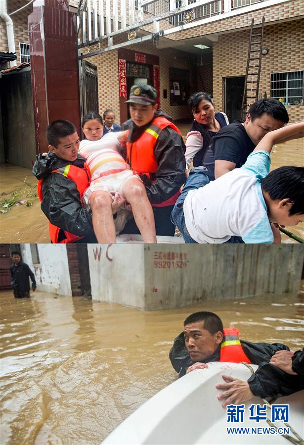 上图:7月2日,“90后”武汉消防支队战士刘峰(左一)将一名孕妇安全转移。下图:7月2日,武汉消防支队战士刘峰跳入水中拉着冲锋舟靠近被困村民。 新华社记者 肖艺九 摄