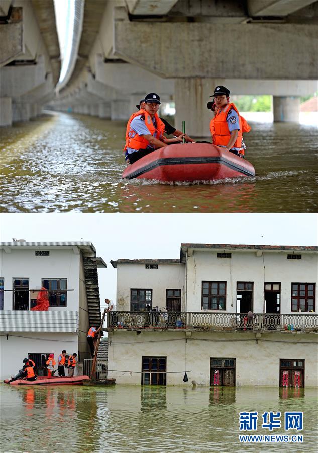 上图:7月9日,吴德伙(前左一)与同事一起乘坐皮划艇前往被淹村庄。下图:7月9日,吴德伙(右二)与同事一起乘坐皮划艇来到被淹村庄劝说留守老人撤离到安全区域。 新华社记者 刘军喜 摄