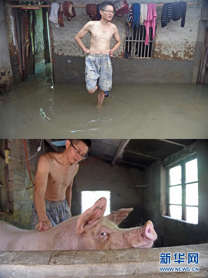 上图:7月11日,被洪水淹没的安徽省桐城市孔城镇桐梓村,55岁的村民倪维国站在自己的家门口。下图:7月11日,被洪水淹没的安徽省桐城市孔城镇桐梓村,55岁的村民倪维国在查看被洪水围困的猪圈。 新华社记者 吴晓凌 摄