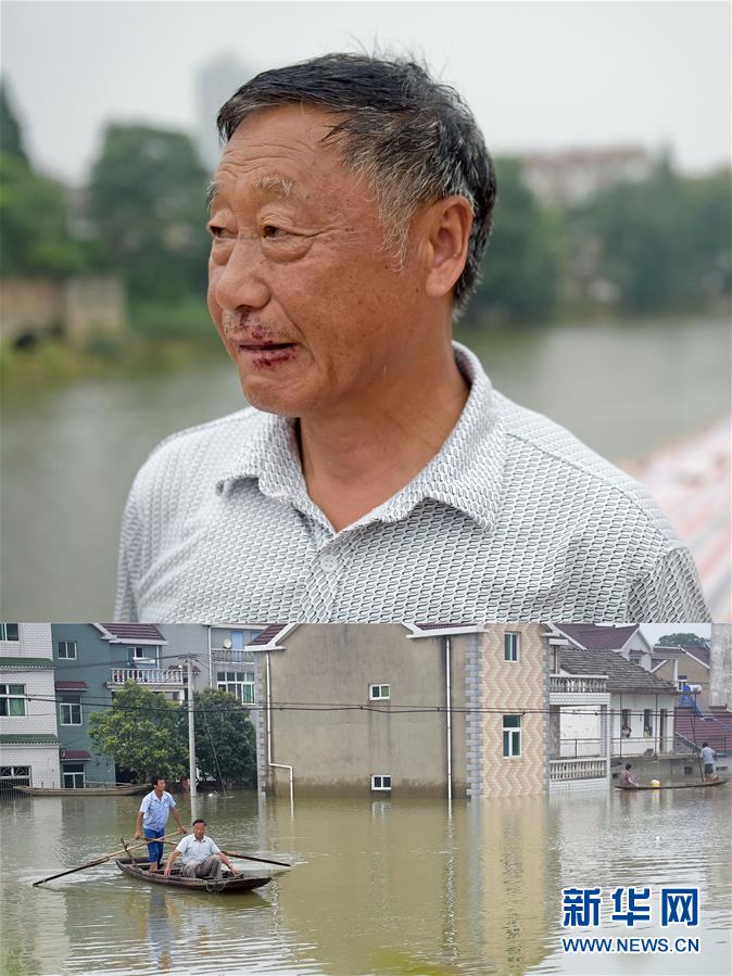 上图:“50后”退休工程师关道明因长时间奋战在抗洪一线,嘴角都长出了水泡(7月10日摄)。下图:7月11日,“50后”退休工程师关道明坐船查看灾情。 新华社记者 张端 摄