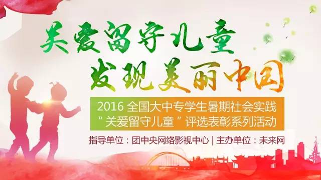 为深入贯彻落实党中央、国务院关于加强农村留守儿童关爱保护工作的有关精神,深入学习宣传贯彻习近平总书记关于青年成长成才的一系列重要论述,组织动员广大团员青年开展多种形式的留守儿童关爱和互助活动,切实引导和帮助广大青年学生在社会实践中受教育、长才干、作贡献,发挥未来网未成年人专属网的属性,营造全社会关爱少年儿童的氛围,共青团中央网络影视中心决定开展 “关爱留守儿童,发现美丽中国”2016全国大中专学生暑期社会实践“关爱留守儿童”评选表彰系列活动,以突出典型,表彰先进。
