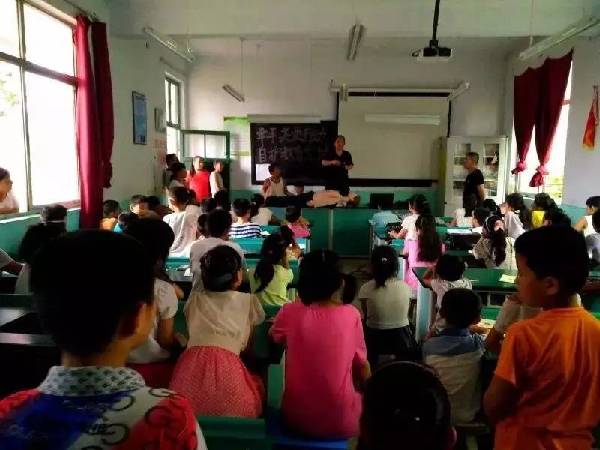 博山镇朱西村村委,“牵手关爱行动”志愿者们在此开展自护教育巡讲活动。古旧的院落里挤满了孩子们的身影,原来刚好是有到这边进行支教的大学生,组织孩子们第一天报名。