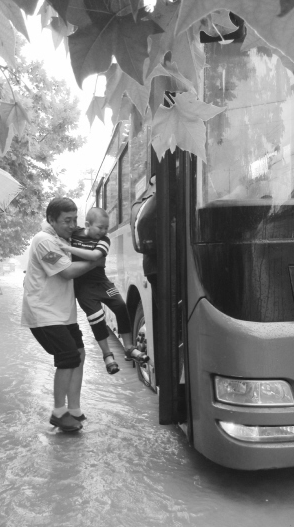 公交司机吴占荣雨中抱小男孩上车。 石家庄日报记者 李兵 摄
