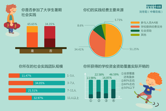 这个暑假,大学生们的社会实践队伍将分赴全国各地。7月中旬,中国高校传媒联盟面向全国141所高校425名大学生发放问卷,调查结果显示,65.65%的大学生受访者参加了暑期社会实践,实践过程中人均开销在500元以下的占53.05%。73.48%的受访者所在学院或学校设立了专项资助,所获资助额度低于500元的团队占62.37%。