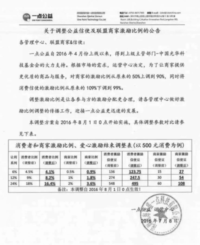 7月11日,一点公益在官网发布公告,对消费者和商家的激励比例做出了调整,其中,“消费信使的激励比例从原来的109%下调到99%”,尚不知这次调整与“刷单”和维持销售额是否有直接关系。