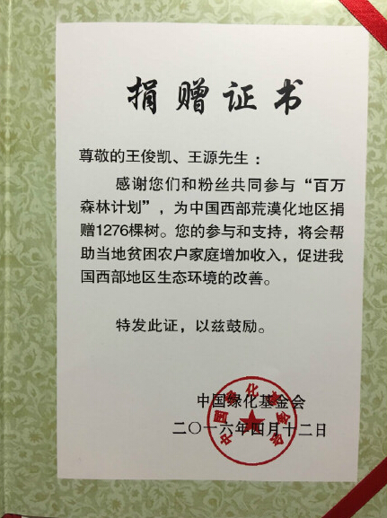 中国绿化基金会给王俊凯与王源颁发的捐赠证书