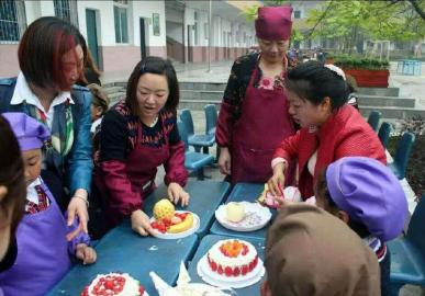 肖学勤(左)教学生制作蛋糕。