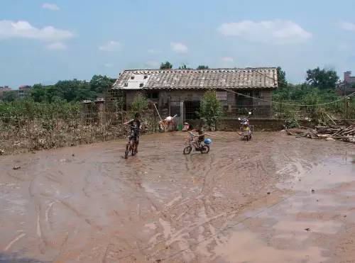 (洪涝灾害后儿童在泥泞地上玩耍)