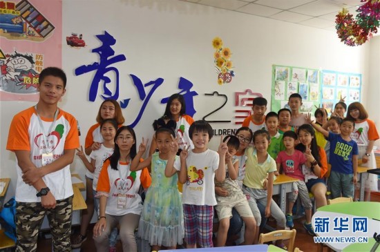 7月26日,在爱心课堂,兰廷双(左一)与团队成员和孩子们一起合影。