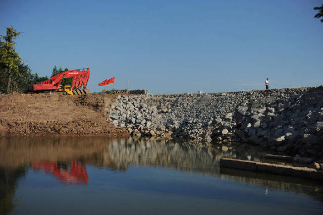 7月10日,湖南省华容县华容河治河度镇河段,7月10日11时左右发生堤坝决口,下游十几个村庄悉数被淹,在抢险救援中,出现了一种惊心动魄的方式:身系安全绳的抢险人员驾驶着载满麻石的卡车驶向溃口,在卡车坠入溃口前跳下卡车,用连车带石的方式堵溃口。图为当日现场。宁默/东方IC