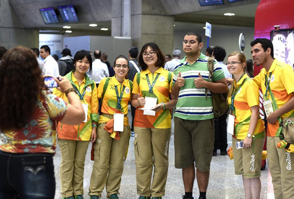 8月2日,张晨欣(左一)和陈韵(左三)在和旅客合影。里约奥运会即将开幕,会场内外都能看到中国志愿者的身影。在里约国际机场,3名中国志愿者张晨欣、潘赛一和陈韵正在紧张忙碌着,她们用娴熟的外语引导着来自四面八方的奥运旅客。张晨欣、潘赛一和陈韵都是里约奥运会的国际志愿者,自费来到里约,在经过奥运知识、奥运礼仪、服务规则和应急救助等培训后,成为一名合格的奥运志愿者。短短一周,志愿者们已经爱上里约这座热情而充满活力的城市。她们表达了一个共同的心愿:用自己的倾情投入,展示最美的“中国名片”。本届奥运会从全球共招募约5万名志愿者,有超过一半的人来自里约以外的城市,他们和巴西志愿者一起为里约奥运会提供语言、赛场、媒体、公交等各种志愿服务。新华记者燕雁摄