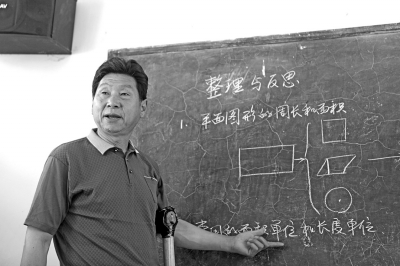 大山、树木掩映下,学校显得更加安静、质朴。孙克会正在上课,讲台上,他左腿空空,右腿有力地支撑在地上,左手拄着拐杖、握着课本,右手拿着粉笔在黑板上写字。