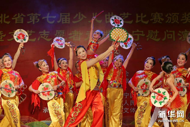 8月14日,秦皇岛市抚宁区文艺志愿者在表演河北省非物质文化遗产“抚宁太平鼓”。