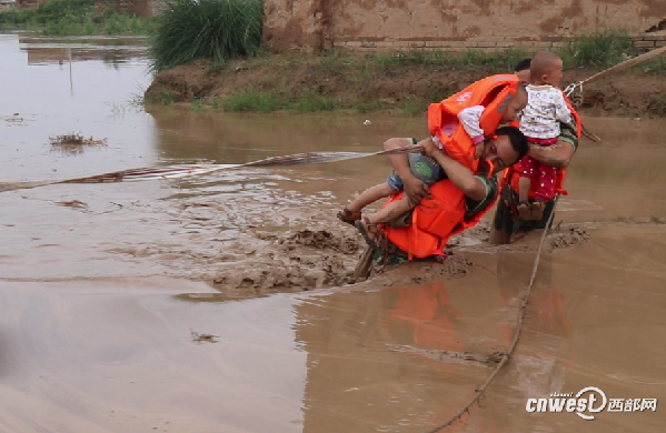8月15号下午(2点30分),(陕西省)定边县安边镇石洞沟张寨子村因连日暴雨,河堤被彻底冲垮,导致全村被洪水淹没,50多户群众被困,受灾严重,消防官兵组成人肉传送机,8小时紧急救援。