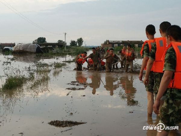 暴雨致定边一整村被淹50户被困,消防官兵人肉传送。