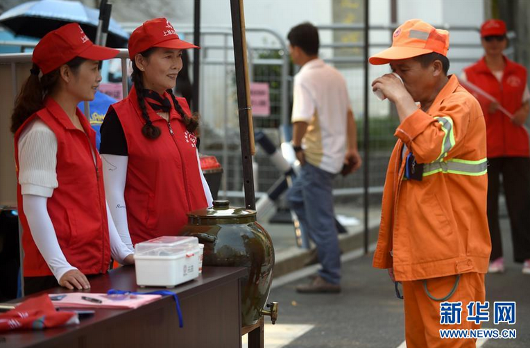 8月24日,来自杭州清波街道的志愿者陈林娟(左二)和同伴在杭州柳浪闻莺景区入口处为游客和市民提供免费凉茶。