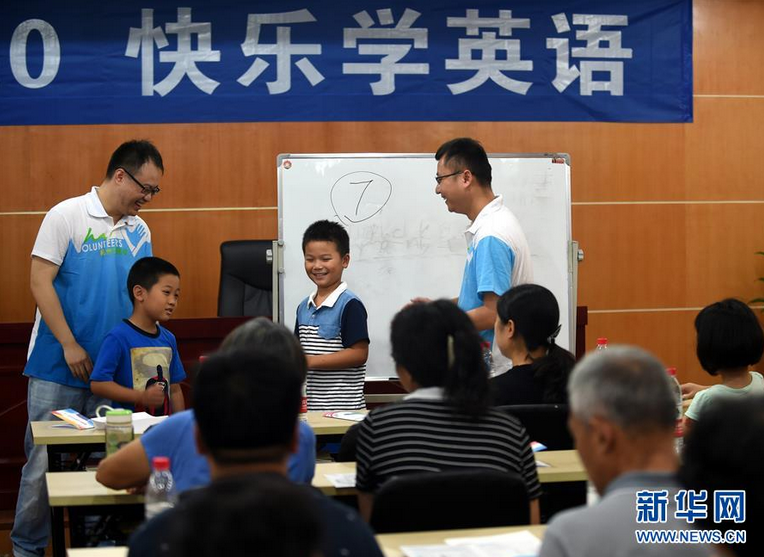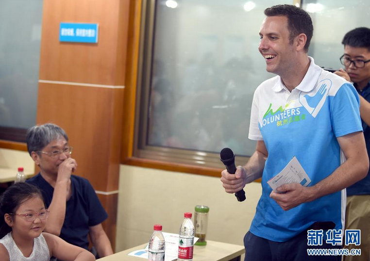 来自浙江大学的志愿者、澳大利亚留学生提姆在杭州东山弄社区教居民学英语(8月2日摄)。