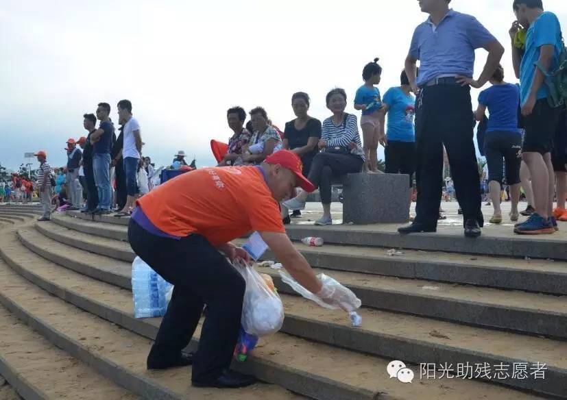 本次活动共分为文明劝导和垃圾清理两个部分。志愿者们在山海天旅游度假区阳光海岸沙滩停车场及沙滩劝导游客文明旅游、有序停车;在随风飘扬的队旗下,志愿者协助景区管理人员捡拾沙滩上的矿泉水瓶、果皮等垃圾。活动得到了游客及市民的一致好评。身穿橙色的志愿者队服的他们,在海岸上形成了一道靓丽的风景线。