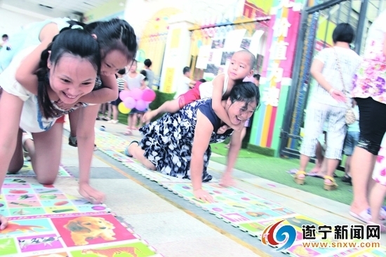 首先进行的是袋鼠宝宝游戏,由临时家长背着孩子在地上向目标位置爬行,哪一队先到达就算胜出。随后,又是小脚踩大脚游戏,志愿者将孩子们和他们的临时家长们的脚用绳子拴在一起,然后齐步向前行进,3人一组,哪一队先到达则为胜出。