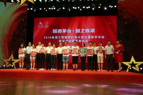 8月26日,由中国青少年发展基金会、茅台集团、共青团湖北省委共同举办的“国酒茅台 国之栋梁”—2016希望工程圆梦行动大型公益助学活动助学金全国发放仪式在湖北省红安县举行。即日起,新受到资助的2万名学子每人将领到5000元助学金。