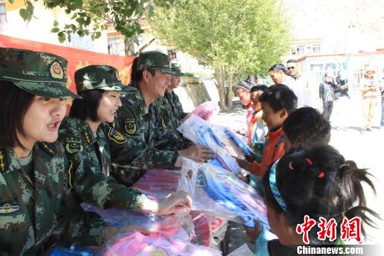 西藏公安边防总队侦查支队定日站联合社会爱心人士,在珠峰脚下开展“情满边疆,承载希望”爱心助学活动。图为官兵向孩子们捐赠书包等学习用具。 袁聿崑 摄